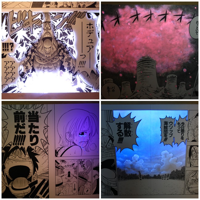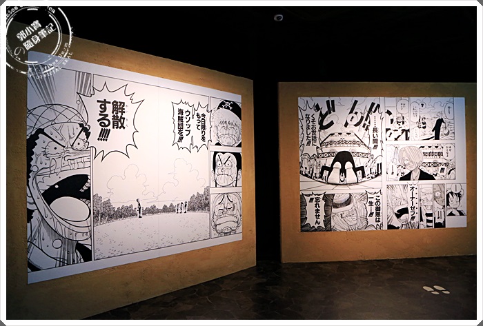 | 一進門就是每個海賊迷都不會忘記的那些頁面,是草帽海賊團每個人要加入時的畫面,只要雙腳站在漫畫前面,就會有音效跟燈光效果,超炫的!! |