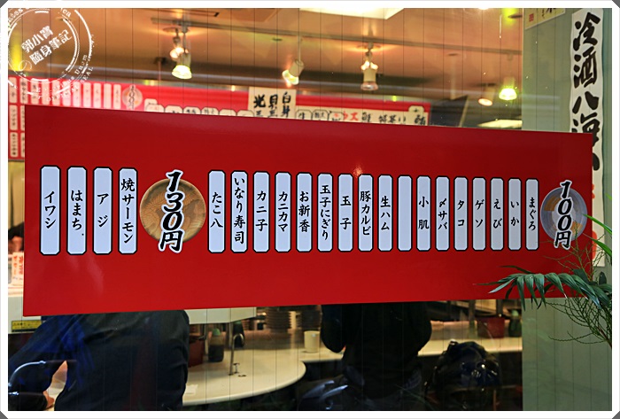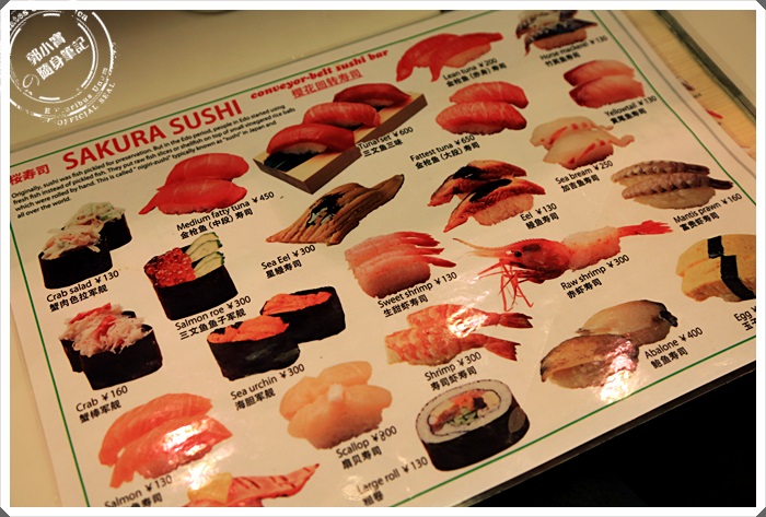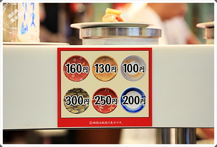 | 櫻すし迴轉壽司大致上分成六種價位,最貴的是300円的金色彩盤,整體上看起來算是相當的便宜,有些幾乎跟台灣的售價是一樣的。 |