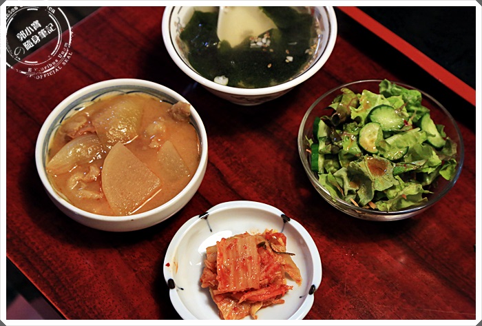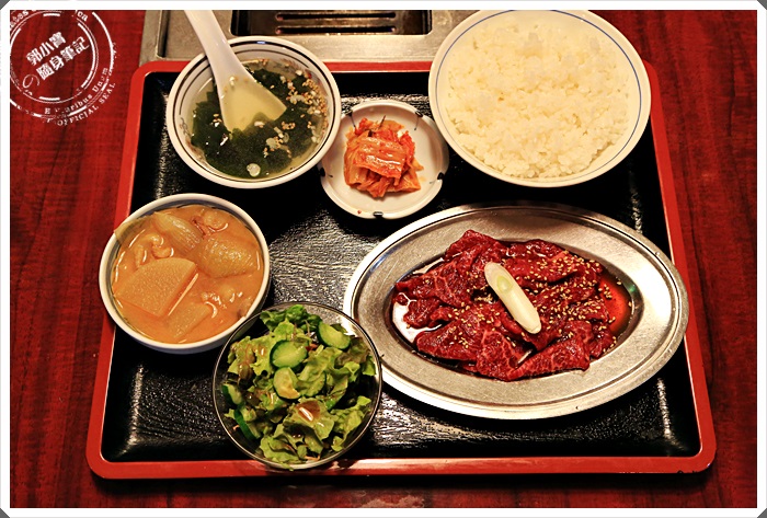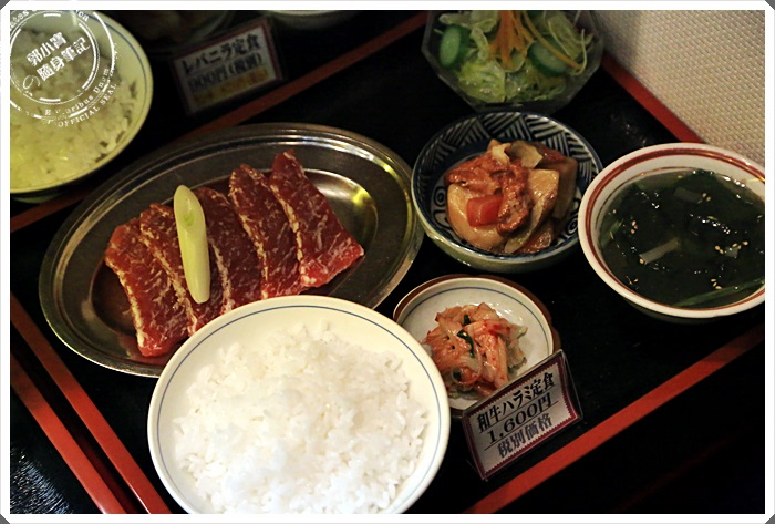 | 我其實要點之前猶豫滿久的,因為我一值認為ハラミ是內臟的意思,想說點個內臟套餐是搞屁,但是外面的模型看起來又像肉,結果問了朋友才知道是內臟肉,也就是橫膈膜那附近的肉,套餐的配菜還滿好吃的。 |