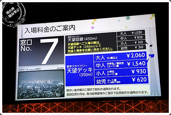 晴空塔是屬於東武電鐵最幾年最知名的代表作了,幾年前剛開張的時候基本上是一票難求,除了預約預約再提前預約,幾乎都沒辦法擠上去,跟台北101大樓剛開幕的盛況是一樣的,不過直到現在,一點都不需要預約,連排隊不不太用了,隨時去買票大概20分鐘內就可以搭到電梯上樓了,我們當天還再假日晚上去的,其實人潮也是零零落落的。