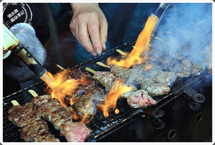 反正到那附近看到煙搞得很像失火的那一家就對了,因為這樣一整面的日本牛肉串剛烤好就會被搶空了,看著整個台子油花四濺的樣子真的很讓人流口水。