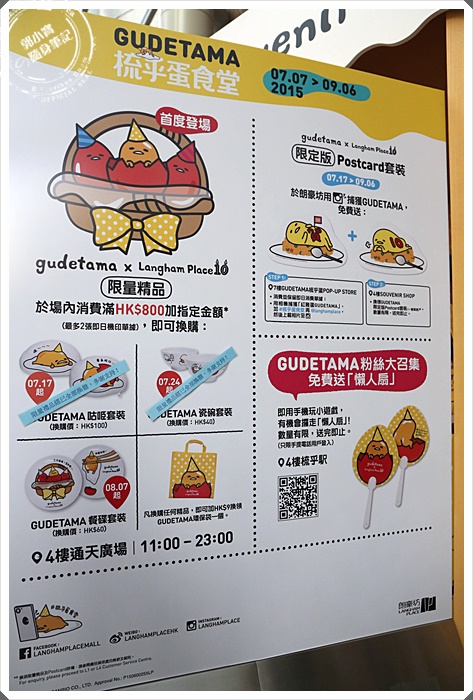 參觀完了整個疏乎町後可以上到7樓,7樓有一間蛋黃哥的商品販售店,只要消費滿一定的金額,還可以加價購許多蛋黃哥的周邊商品,活動辦法的海報我也拍起來給大家參考了,如果你是蛋黃哥的粉絲,那真的不要錯過這個地方,因為真的是超療癒的,最近有要去香港的朋友,可以把這個地方排進去行程,來療癒一下自己的心靈吧XD