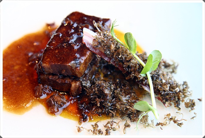 | 夾起叉燒入口一塊,確實頗讓人震驚,那六分瘦肉四分肥肉的比例抓的相當的好,肥肉油膩卻不礙口,搭配著軟嫩瘦肉咀嚼後散發出自然的香甜,油脂來的恰到好處,滿嘴油膩卻不難受,醬汁刷的沒有想像中的甜,但是那股淡淡的甜味令人難忘,詢問後才知道主廚是使用台灣現在也很紅的伊比利豬,難怪在瘦肉的口感上可以表現得那麼好! |