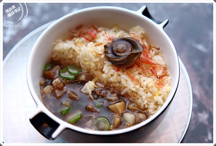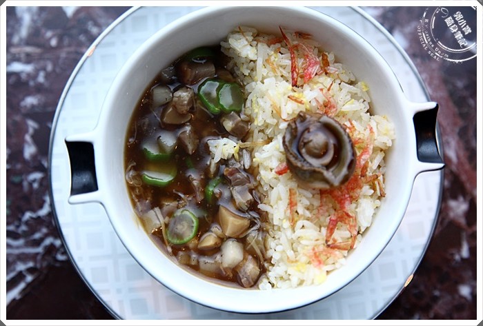| 這是我個人很喜歡的一道,端上桌的時候就可以聞到超濃郁的櫻花蝦的香氣,本以為是櫻花蝦炒飯,米飯感覺是使用泰國長米,吃起來口感比較好,伴著燴汁頗為順口,燴汁調味也不會過重,最特別的是一入口櫻花蝦的味道完全不見,整個跟燴汁融合再一起了本來我還很擔心櫻花蝦會搶味,點綴的小鮑魚具有畫龍點睛的效果,Q脆彈牙的小鮑魚增添了許多口感上的變化。 |