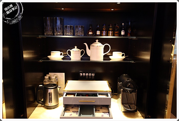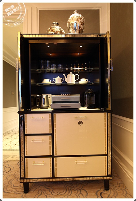 最上層有一些小瓶裝的威士忌酒與威杯,第二層就是茶壺跟咖啡杯,最下層就是咖啡機跟茶包放置的地方。