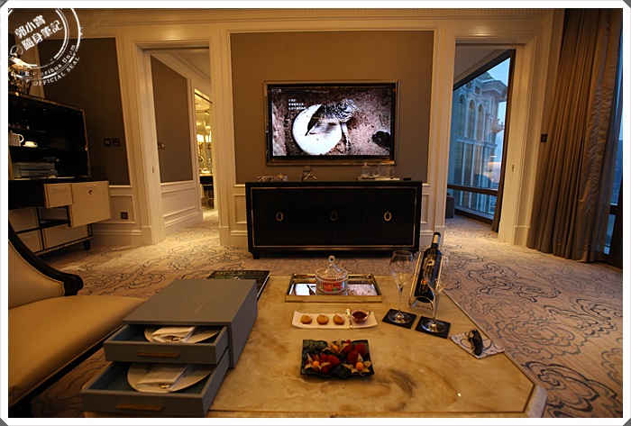 | 這邊的家具很多都是使用大理石跟木紋皮飾,讓人還沒到歐洲就可以感受到歐洲的風情,主要分為內臥房外客廳,兩個房門通往臥室,桌上會準備點心給房客使用。 |