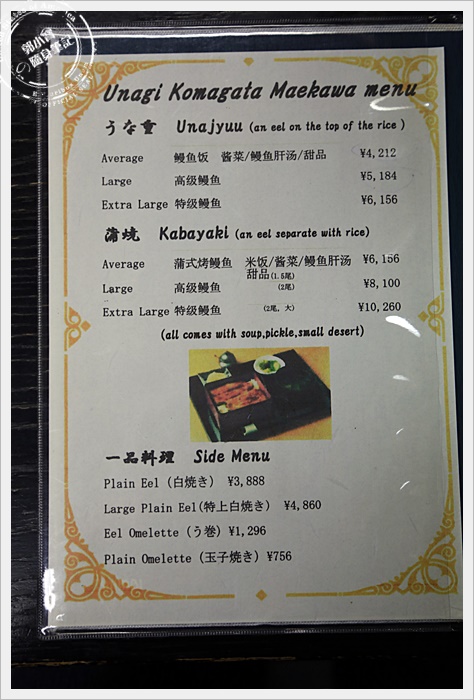 浦燒鰻魚總共分為三種價錢,分別是6156、8100、10260三種,最主要的差別在於鰻魚的分量,我們點的是6156有1.5尾,10260的份量可以到2尾(大)的,因為我們又單點了白燒鰻魚跟鰻魚便當等,所以這一份就選6156。