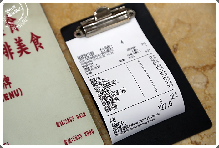 | 附上新鴻發的帳單,我覺得厚切西多士真的算是澳門必吃推薦的商品了,不難想像它的美味,奶油加上法是吐司還有花生醬,其實技術性不難,但是在香港跟台灣好像都沒有看過有人這樣做過。 |