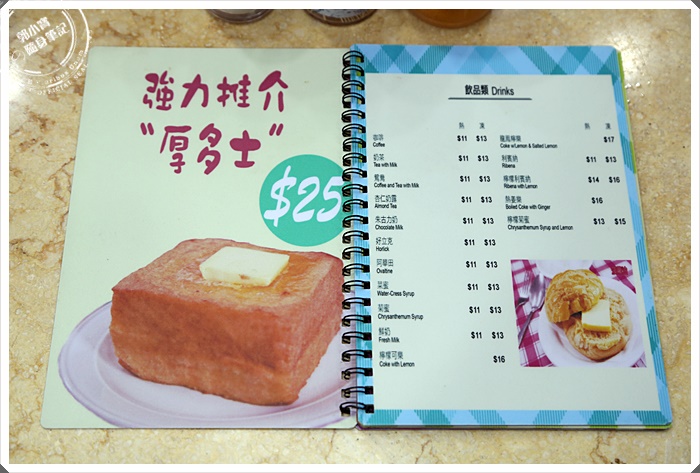 | 菜單一翻開來就看到他們的招牌超厚西多士,新鴻發的品項也非常多,看得我眼花撩亂的,但是好險我們這次的人數頗多,戰力也還算強。 |