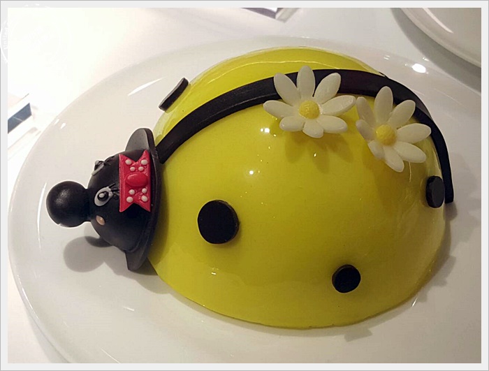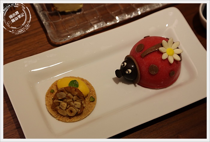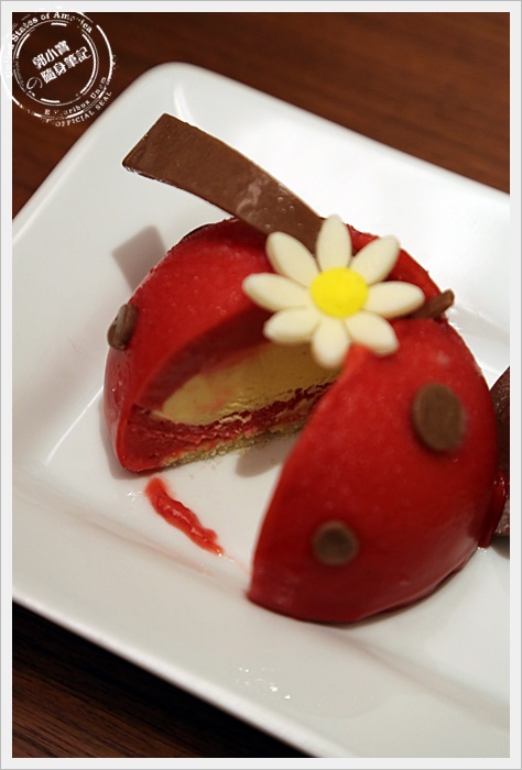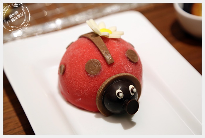 | 這瓢蟲真的是太可愛了,整個頭是巧克力做的,中間的身體是覆盆子,聞起來真的有一股酸甜味。 |