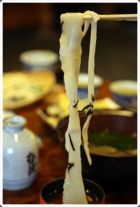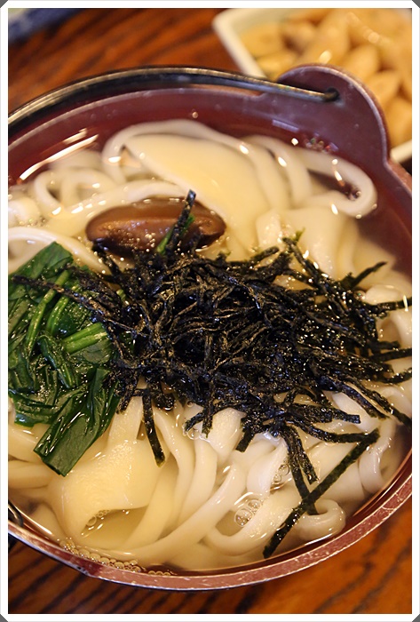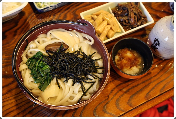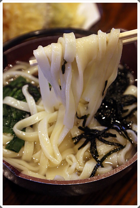 | 山一屋的烏龍麵外型就跟一般圓形胖鼓鼓的不一樣,他們家的烏龍麵是扁長型的,且厚度還滿厚的,夾起一口後送入嘴裡,沒想到溫烏龍麵的口感還是可以那麼好,尤其她的麵體比較厚,吃起來卻有彈牙口感,真的很好吃。 |