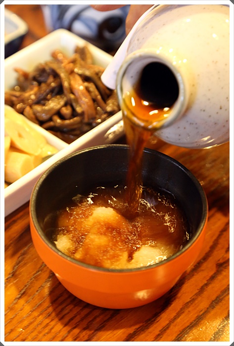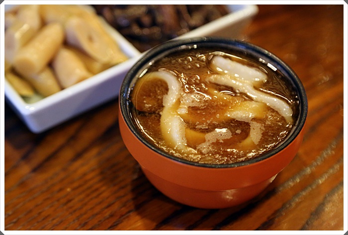 | 每個桌子都會送來一壺醬壺,醬汁不夠還可以倒,一開始送上來的湯汁是原味的,還有另一碗裡面有蘿蔔泥,倒入醬汁吃起來風味又整個不一樣了,沒幾下就被我沾完了。 |