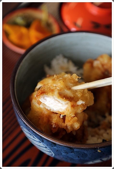 | 特別限定的雞肉丼,除了有一個丼飯以外還有附小菜跟味噌湯,炸雞肉的份量還挺多的,每一塊的尺寸都滿大的,大約有5.6塊左右,是採用當地的地雞,但是似乎也沒聽過當地的地雞有比較有名的。 |