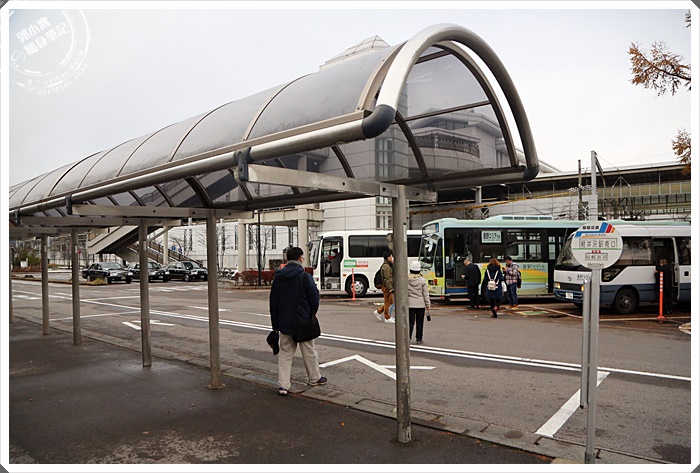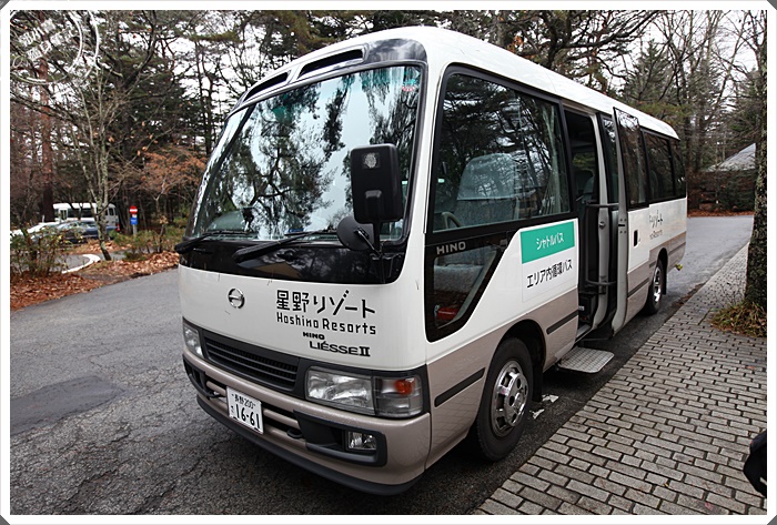 來到輕井澤只要是女生都一定會喊著要去星野度假村的石之教堂看一下拍拍照,我們這一次也免不了女孩子們的聒噪,所以選了一天一大早準備護送它們到星野度假村,到達車站的公車站有免費的接駁車,星野度假村有固定的班次來這邊接駁,那我說不出來什麼顏色的車子就是星野的專車了,一大早還牌了滿多的人。