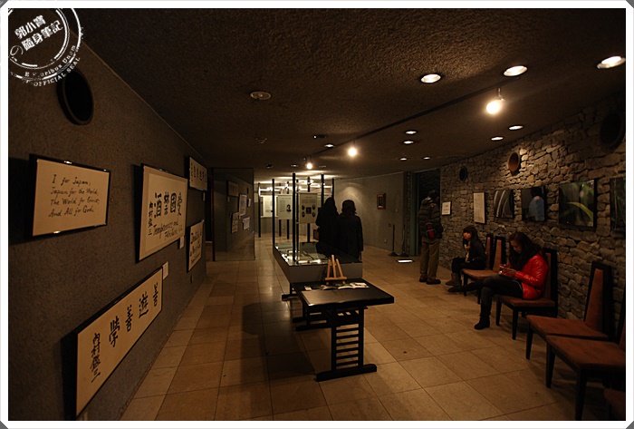 | 一進來是一個藝文空間的感覺,壁上掛滿了畫作?毛筆字? 就是簡單介紹石之教堂的起源的一個地方。 |