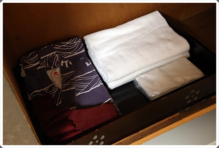 | 衣櫥裡面也放置好了浴衣跟外套,還有去大浴場時要使用的小毛巾,整齊地擺放在衣櫥裡面。 |