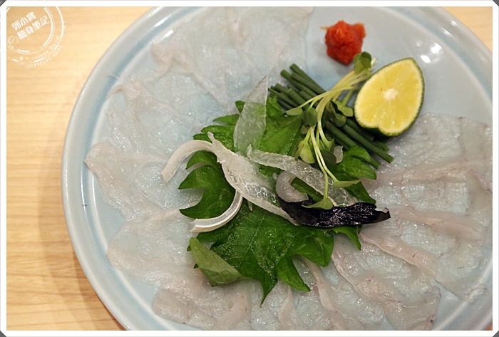 | 片的薄博的一片,其實不沾醬就很好吃了,河豚搭配的醬主要都是偏酸甜為主。 |