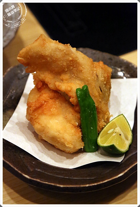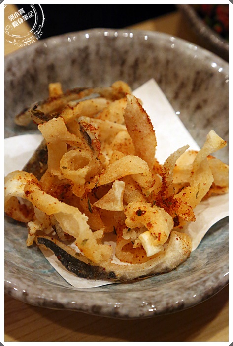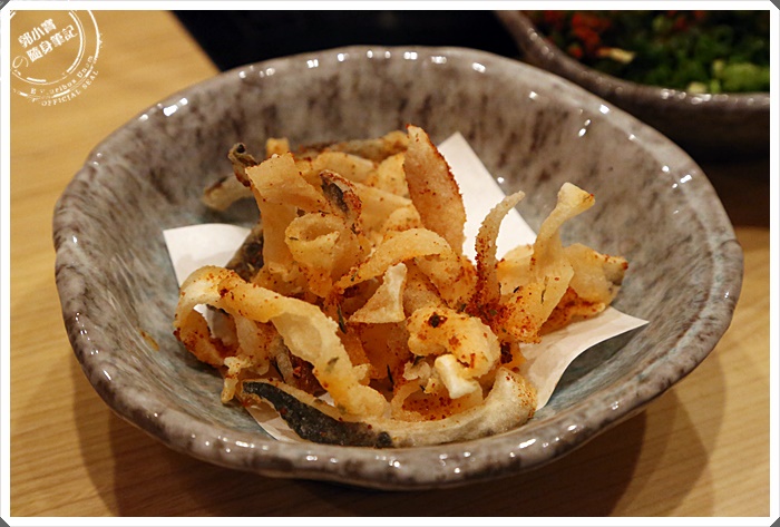 拍到一半送來的酥炸河豚皮,女生們感覺要搶食了,所以趕快拍了兩張,酥脆口感就像餅乾一樣,沒有甚麼味道,吃了幾條後覺得有一點油。