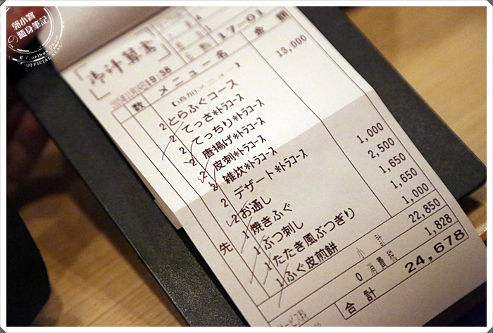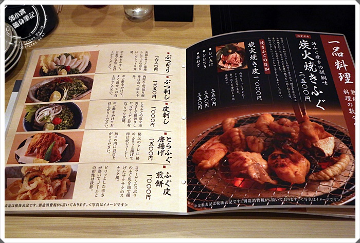 | 河豚料理的價位其實並不低,我們點了他們的套餐,二個人的費用是13000円,然後再加點其他食材,當中還有我在玄品沒有吃過的炭火燒。 |
