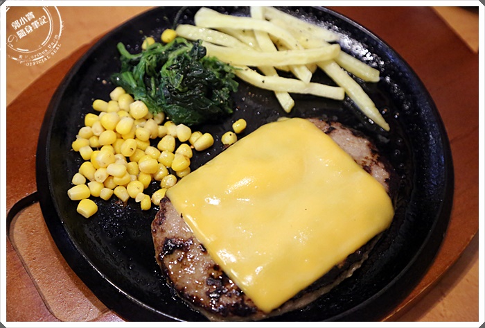 看起來份量相當的多,漢堡肉上面還有一大片起司,配菜有薯條根玉米還有波菜。