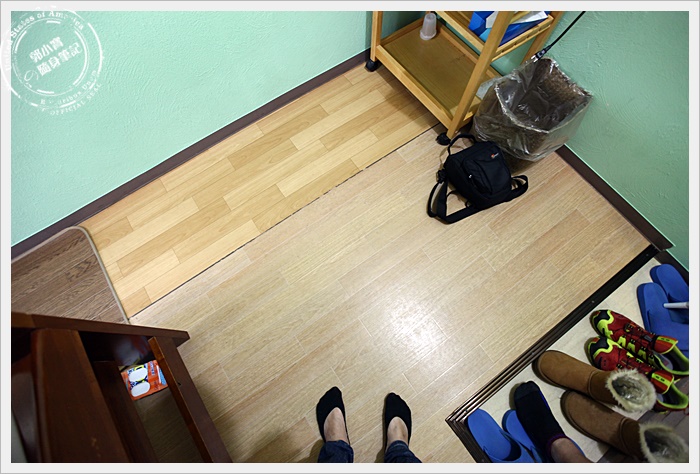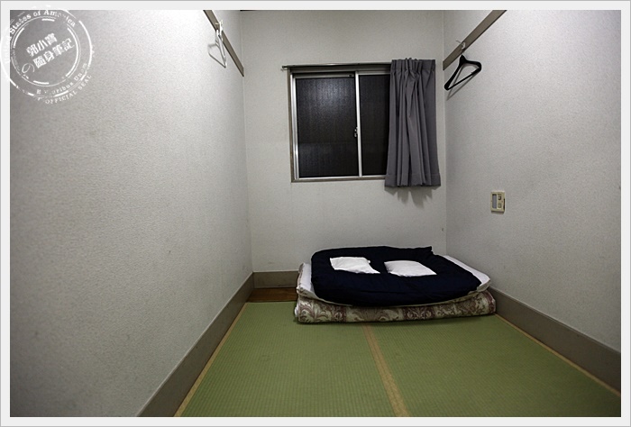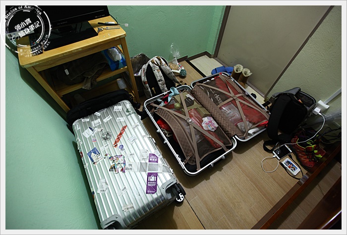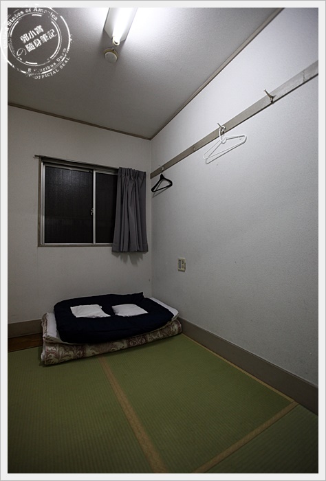 | 打開房門後前面只有一個小空間,但是比起兩張半的榻榻米床來說這樣已經很好了,因為房價確實也相當的低廉,至少我們還可以把兩個大行李箱平放,有一個三層小櫃子,上面有一台小銀幕。 |