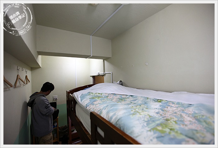 把行李推到床邊大概是一張榻榻米大小的空間,只是呈現一個正方形。