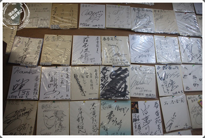 | 到了這一家店名很不像燒肉店的春香苑以後(真心感覺他的名子也太按摩店了),才知道這一家春香苑是別府的老店,已經有很久的歷史了,一進到門內就看到櫃檯旁邊貼了滿滿的簽名,不知道已經有多少媒體來採訪過了,有時候吃美食還真的要當地人帶路啊!!! |