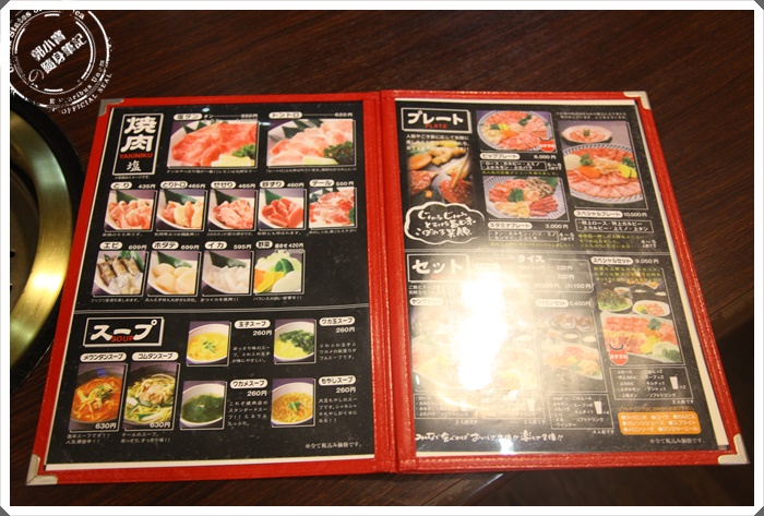 | 翻開菜單看了一輪後來就請社長幫我們點,最後社長直接交代店員把最好的肉都拿上來,後來回台灣才知道,春香苑在日本確實小有名氣,有名氣卻不是因為牠的肉,而是他的冷面,他的冷麵可是很多拉麵店跟麵食類的都會拿春鄉愿的冷麵來當評分標準,意思就是當天我們沒有點到冷麵真的超懊悔了! |