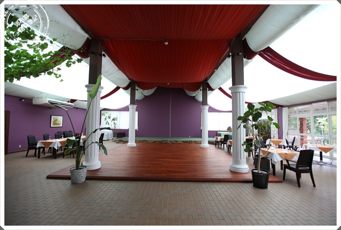 | 泡完溫泉就是準備吃晚餐的時候,我們入住的是有含兩餐的,他們家的餐廳根本就是結婚禮堂了,布置的超美的,還有隔間包廂,另一邊都是透明玻璃窗,所以早上的光線很好,下午的時候也很適合喝個下午茶。 |