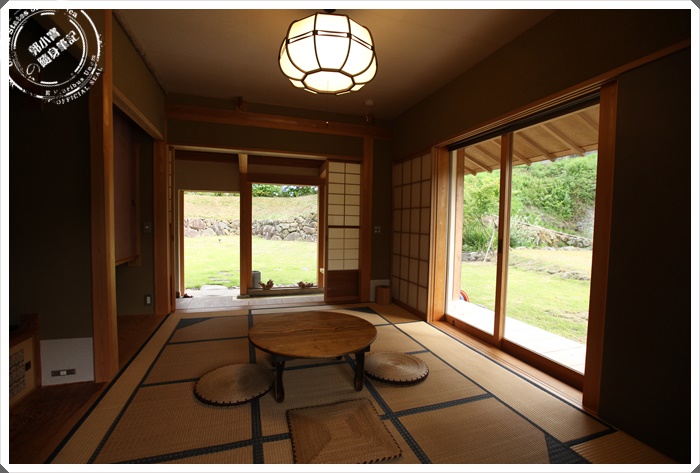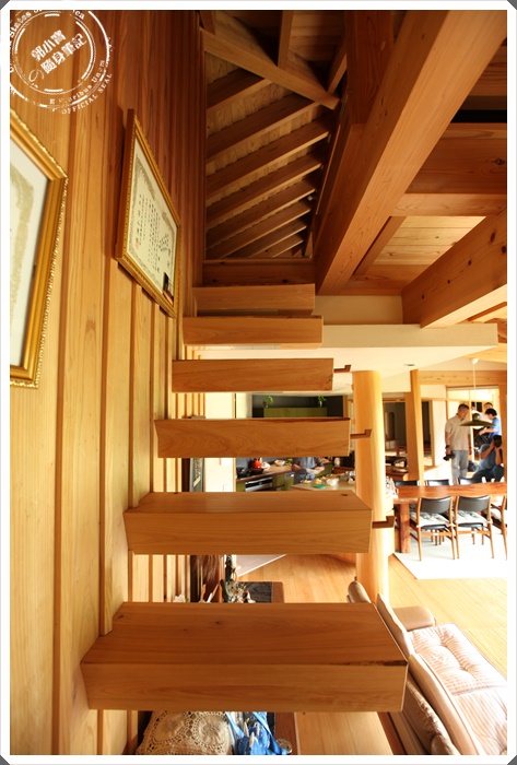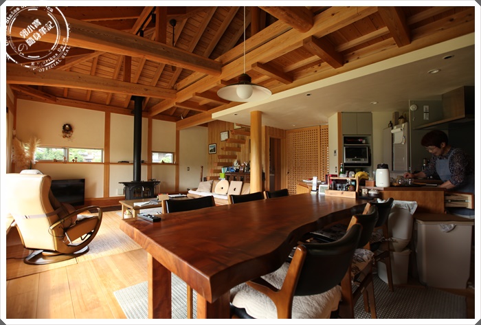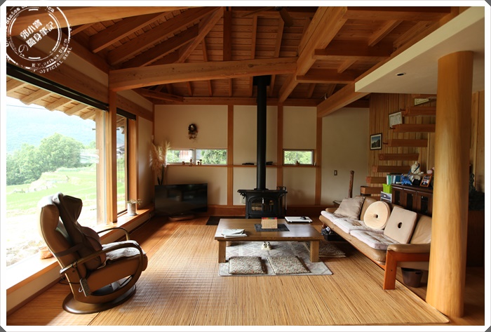 | 玄關前的房間,每個房間四面都可以看到外面,景色一級棒的,一進門就可以聞到木頭的香氣也很舒服,這房子可以主人的兒子採用相當多不同的木頭建構而成,晚上奶奶會來幫大家鋪床。 |