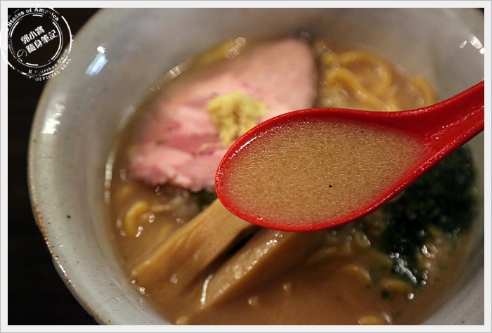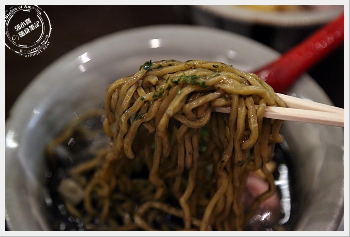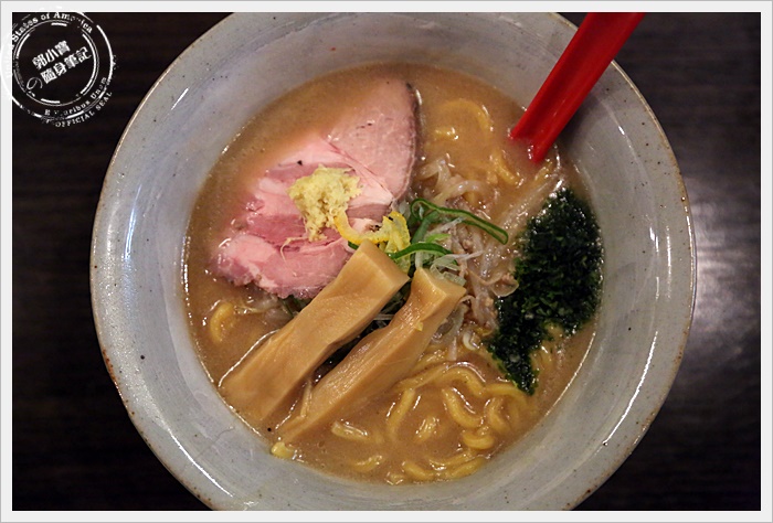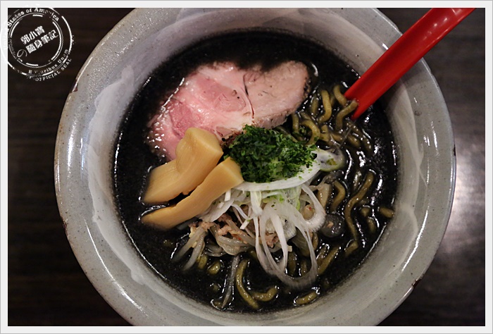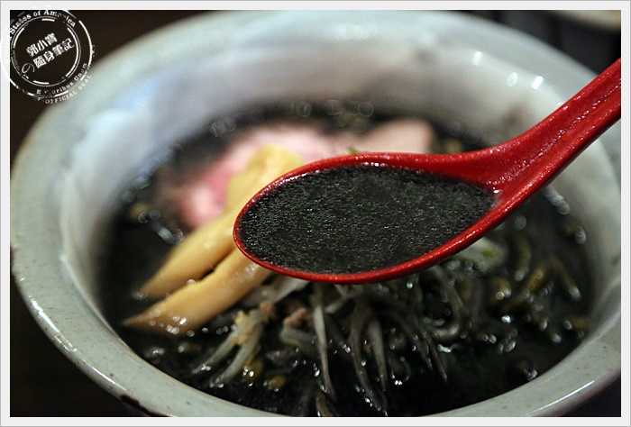 | 喝了一口黑味噌的湯頭,味噌的味道降低了許多,加了墨魚汁的味噌湯頭我還滿喜歡的,雖然鹽度的比例拉高了一點,但是相對味噌濃到不行的比例就沒有那麼礙口,他們家的味噌湯頭喝起來爽口多了。 |