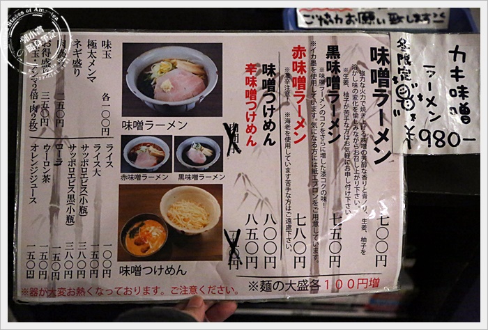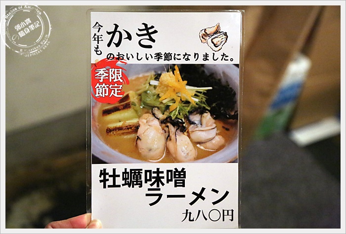 | 其中還有季節限定的牡蠣味噌拉麵,其實這個價位相當便宜,不用千元日幣就可以吃到肥美的牡蠣味噌拉麵,但是當天晚上我們沒有人點這一碗,下次冬天來的話我應該會想試試看。 |