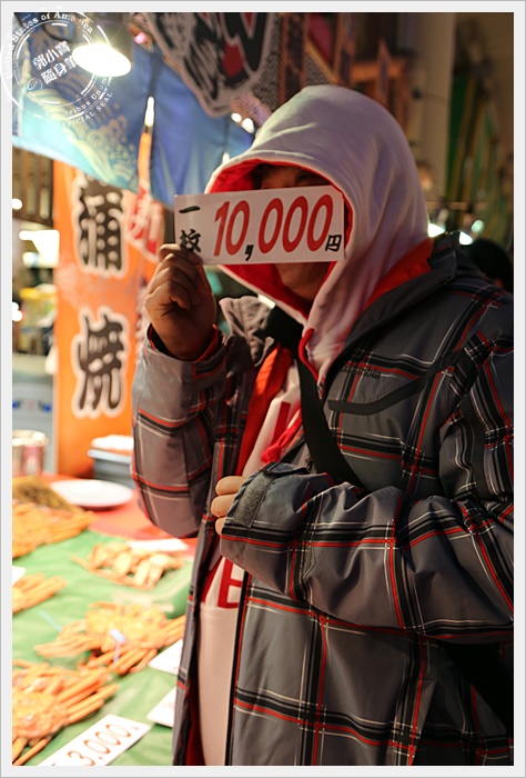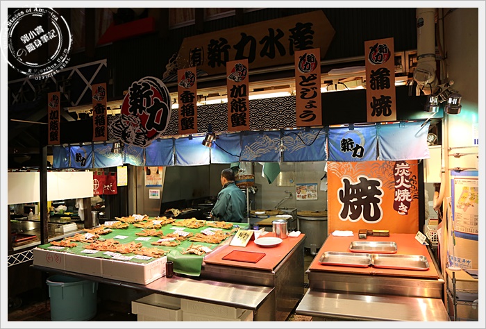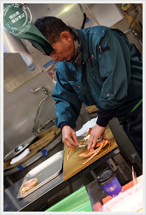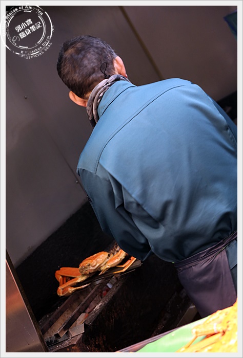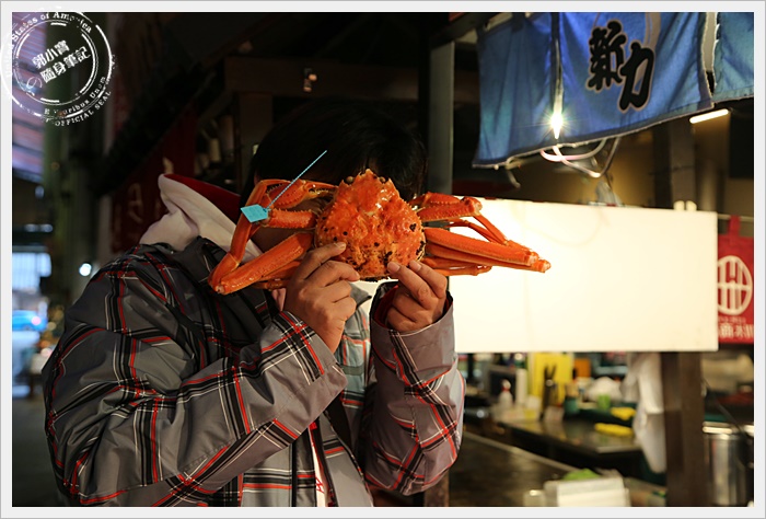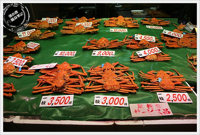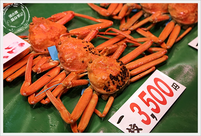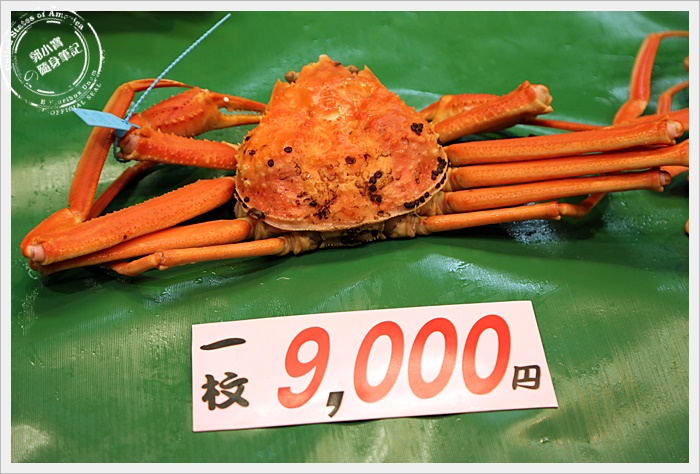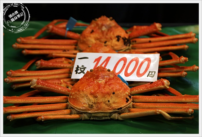 | 對於我們這種觀光客而言,最期待的就是市場內有幾攤是賣螃蟹的,尤其是以日本海域的松葉蟹為主的螃蟹,市場內大概有四五攤都是販售螃蟹為主的攤販,也可以當場幫客人直接烤完上桌,馬上烤馬上吃XD |