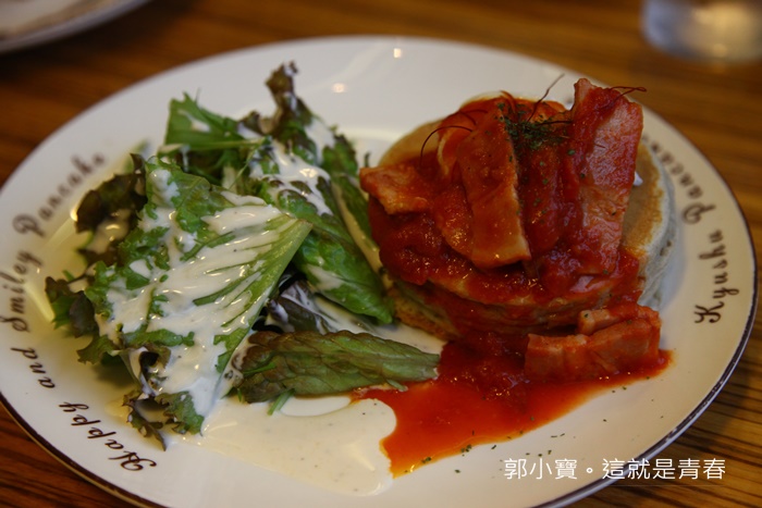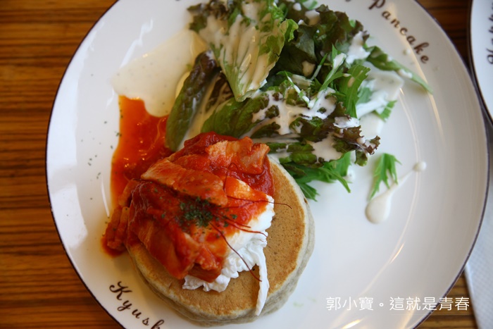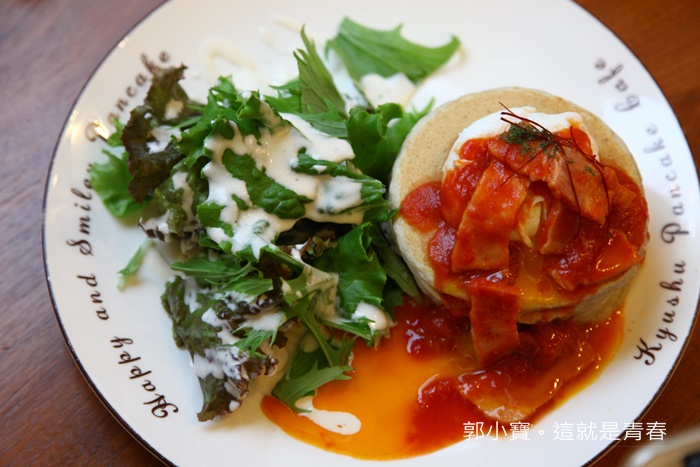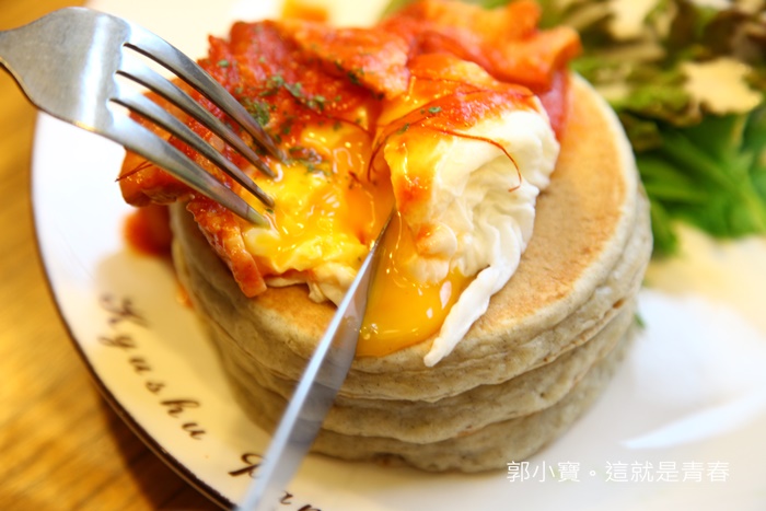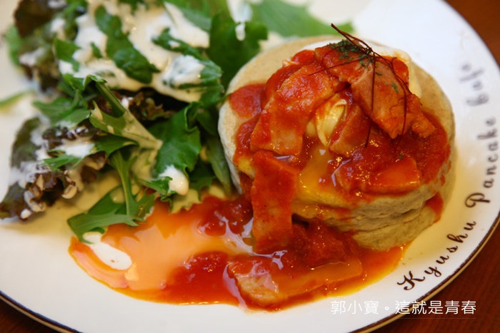 | 看看這超美味的感覺,忍不住趕快切了一口來試試看,紅醬有點像是沙沙的感覺,酸甜滋味搭配九州鬆餅比較緊實的口感,重點是那濃郁的蛋液簡直完美加分,雖然鬆餅本身不是我喜歡的鬆軟綿密的口感,但是他們家的鬆餅即使緊實但卻不會太過於乾口,我很怕吃到緊實又很乾的鬆餅,感覺隨時會卡在喉嚨的感覺,但是這一份餐點真的頗微水準! |