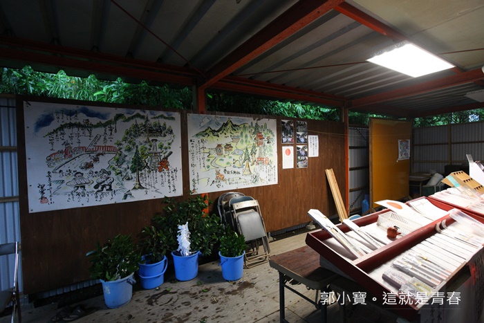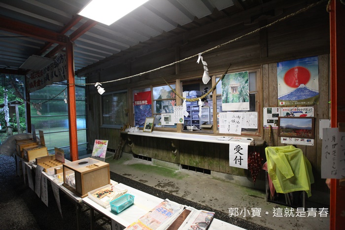 | 入口處反而先看到販售神社物品的鐵皮屋,坐落在森林裡面,感覺有那麼一點幽靜遠離塵囂的感覺,當天下著大雨,本來沒有要上去了,但是對我來說都好不容易來那麼一趟了,當然要爬上那石階參拜一下了。 |