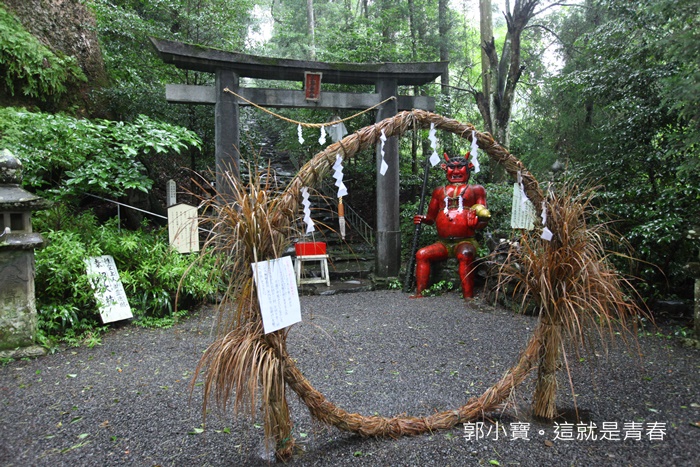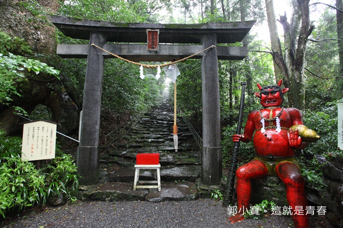 | 通往東霧島神社鳥居前還有日本傳說中的鬼怪泥像,日本友人說這是唯一一間有鬼怪的神社,泥像做的頗有嚇人,但是卻也特別,在綠意盎然的森林裡面,突見一個全身紅的泥像鬼怪,頗為特別,因為很多人看到這樓梯可能就不爬上去了,所以鳥居下面也有一個油錢箱,可以遙拜。 |