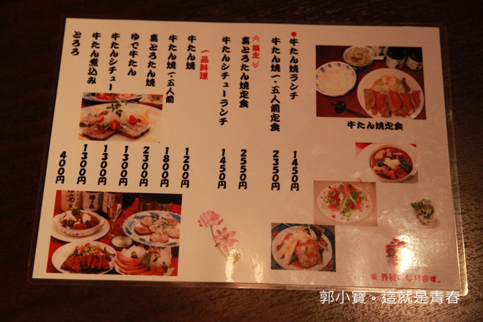 | 看了一下菜單以後決定不點定食,因為肚子還要裝很多其他食物,所以要有效的利用空間,瀏覽了一下就決定直接進攻主打商品,單點頂級的炭燒牛舌跟燉煮牛舌,其實是還滿建議點它們的真牛舌定食,因為跟單點只差了250日幣,就多了白飯跟湯品還有小菜。 |