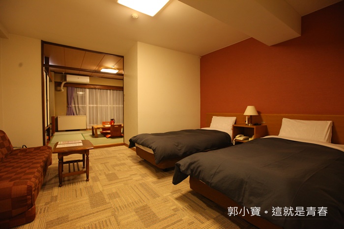 | 一回房打開房間就讓人忍不住驚呼一聲,這房間也太豪華了,是洋式日式合併的房間,一打開房門就是兩張單人床,往裡面走就是和式空間。 |