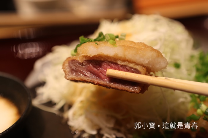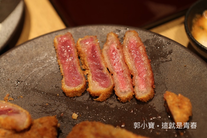 這牛肉橫切面看起來就跟之前的牛肉完全不一樣了,除了牛肉的等級不一樣以外,當然部位也是有差別的,炸完的黑毛和牛的肉看起來粉嫩粉嫩的,帶點油花的感覺,一口吃下果然甜度破表,除了可以吃到揪C的油花根血水以外,那入口咀嚼後的溶化感也很滿意。