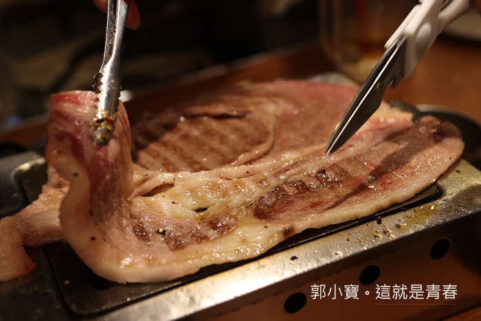 | 超大超誇張的一片牛肉,簡直是比臉還大兩倍的牛肉,這牛肉還滿有特色的,因為過於大片,所以裡面包含了肋眼、沙朗、雪花等部位的牛肉,一整片放到烤爐還滿出來,看起來痛快感就很足,工作人員也會細細的解說這牛肉哪些部位,一部分一部分的分剪給我們,雖然工作人員講得很認真,但是我們一句都聽不懂,哈哈~ |