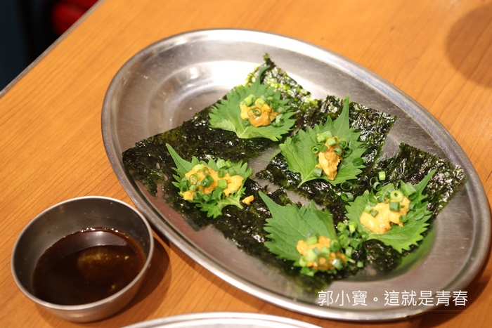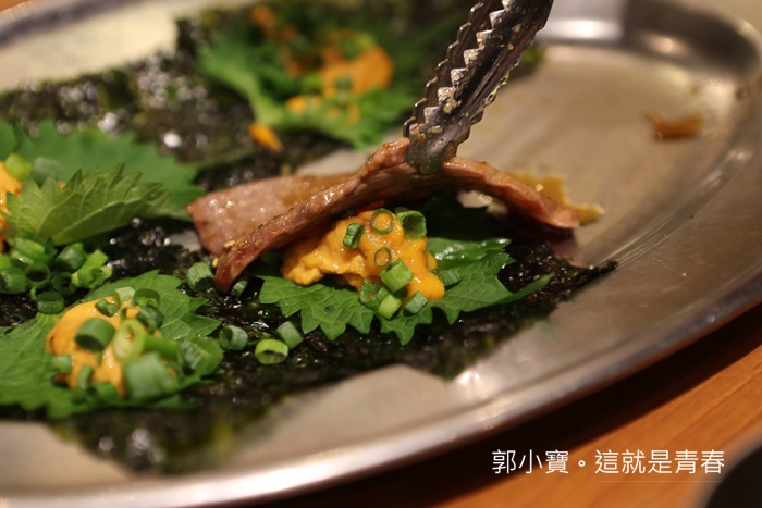 剛剛的黑毛和牛還可以跟這美味的生海膽還有芝麻葉加上海苔一起吃,這一道菜台灣也有,但是日本海膽加上日本黑毛和牛,還沒入口就可以想像這完全不一樣的滋味了,畢竟要在台灣吃到日本牛肉真的是難上加難啊! |