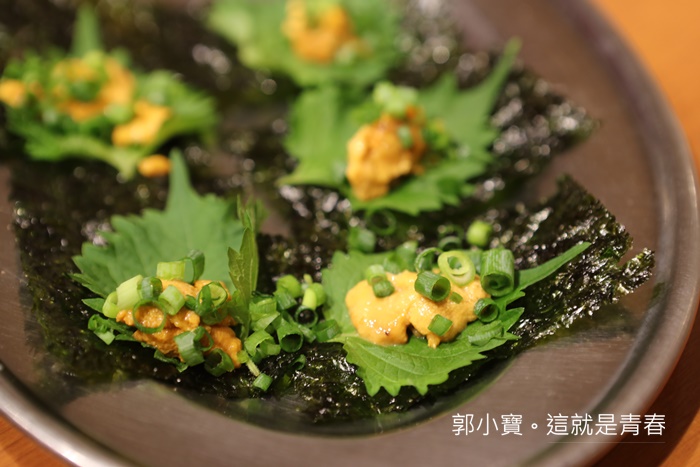 | 將黑毛和牛覆蓋上海膽,一口入口簡直味蕾大爆發,黑毛和牛的油脂跟肉汁混合著海膽的鮮甜還有芝麻葉的氣味,整個層次豐富到了極點,一吃就令人愛上,跟台灣的滋味有著完全不一樣的風味。 |
