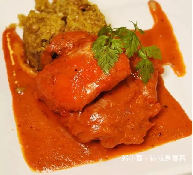 - 碳烤鸡肉配番茄蜂蜜奶油咖喱酱、藏红花藜麦毛豆松仁炒饭