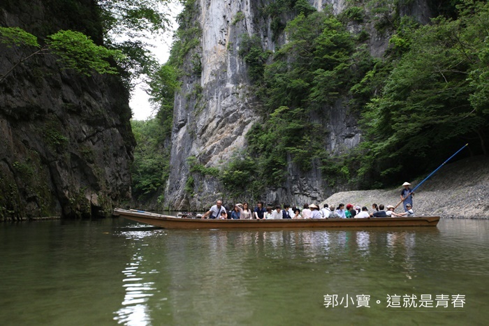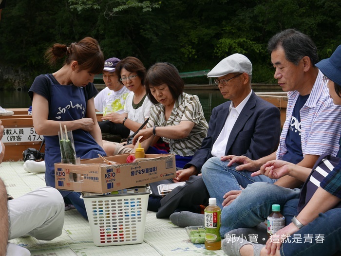 | 整趟行程大約兩個小時左右,兩岸的風景真的很優美,船夫沿路還會說笑話跟唱歌給大家聽,但是無奈我們聽不懂日語,看著船夫一直介紹兩岸的故事及典故,有點可惜沒辦法完整的了解,狔鼻溪水非常清澈,游著上游滑去的時候,船邊都跟著好多香魚XD |