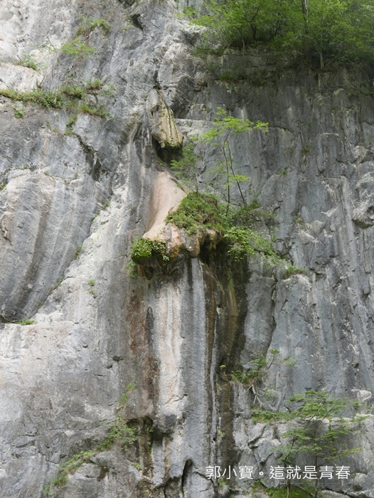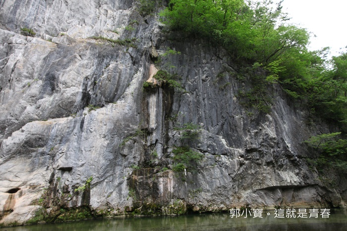 | 到了終點的時候船夫會讓大家上岸,去看一下狔鼻溪的由來,就在石壁上面真的有一個好像鼻子的天然岩石,而且顏色還特別不一樣,好有趣,這個地方彷彿好像是一個世外桃源,上岸的時間大約停留20分鐘,然後就要往回走去搭船回原點了。 |