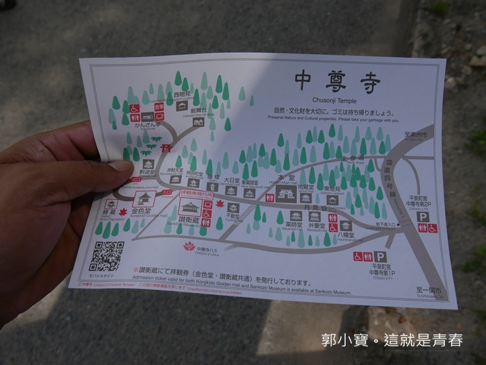 | 中尊寺門口的案內所可能看我們是國外遊客,還特別給我們一張路線的指引圖,中尊寺的範圍頗大,慢慢走下來也需要一兩個小時,途中也有爬坡的路段,頗費力氣,但是好處就是都在樹林下,所以不太會照到太陽,走起來相當的舒服呢! |