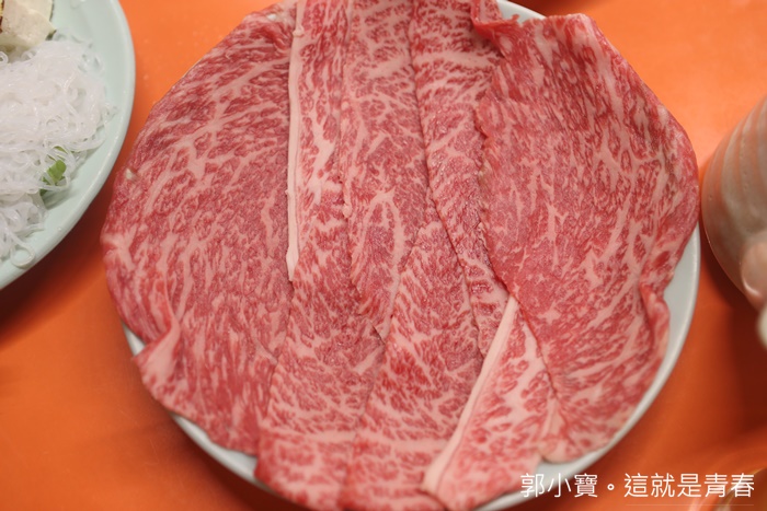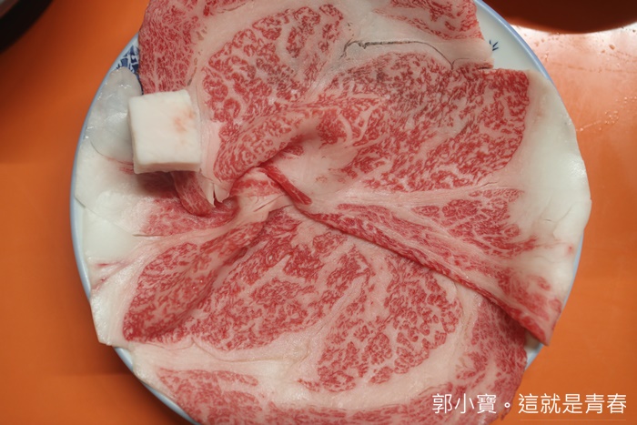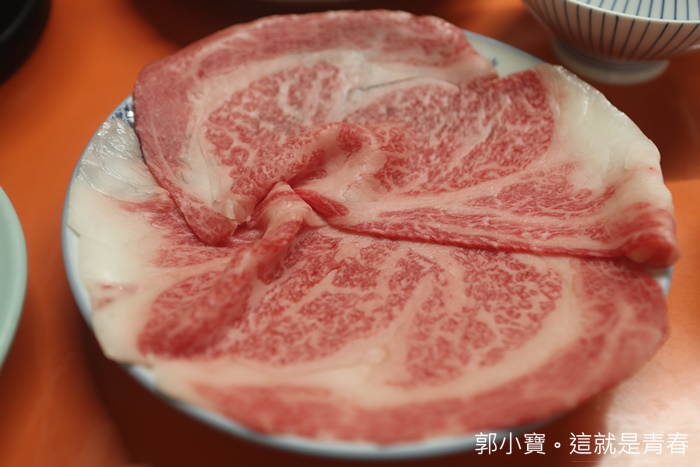 | 我們點了一個上等牛鍋的套餐,米久壽喜燒使用的牛肉是知名的近江牛,俗稱日本三大和牛之一的近江牛遠近馳名,但是我個人最喜歡的還是米澤牛跟山形牛,看看這油花密布的均勻狀真的讓人口水直流。 |