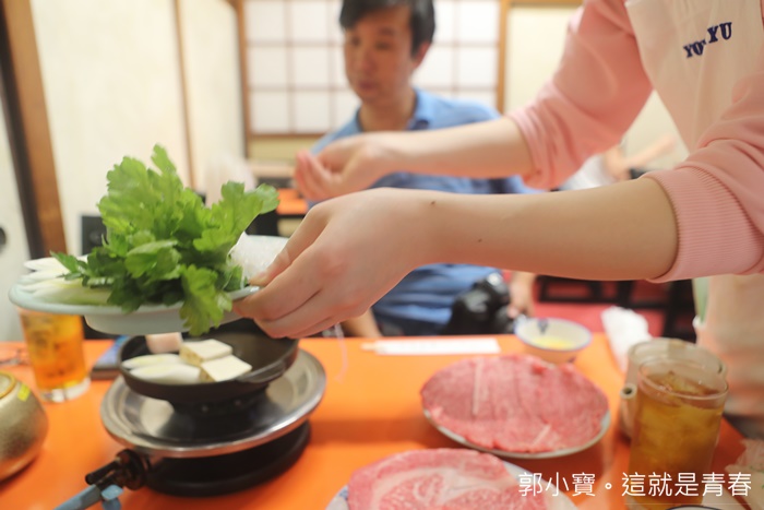 | 一開始的時候是服務生幫忙服務,細心的把野菜盤的食材慢慢夾上壽喜燒鍋,米久的壽喜燒鍋比一般的壽喜燒鍋來的淺很多。 |
