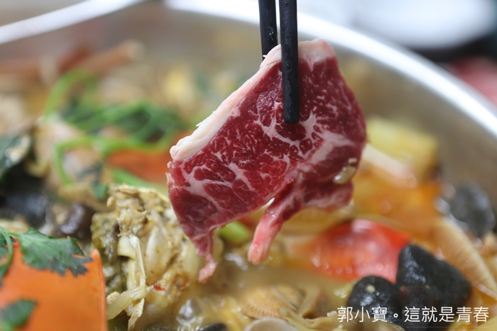 | 花甲蟹鍋的湯頭有點像是沙茶湯頭,但是因為加了許多海鮮下去熬煮,所以湯頭整體算是非常鮮甜,吃完了花甲跟螃蟹後就是涮牛肉的時候了,水佬榮提供的牛肉種類還算滿多的,肥牛肉下鍋涮一下就可以起鍋了,因為牛肉切得比較厚,所以入口的咀嚼感較足,味道也很鮮甜。 |