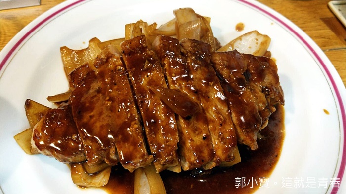 | 豬排口感厚實且口感非常的好,醬汁也滿特別的,搭配白飯比較適合,不然吃了幾塊後會覺得有點膩口,主要洋蔥的甜味也很入味,我還滿喜歡的草鞋燒肉豬排。 |